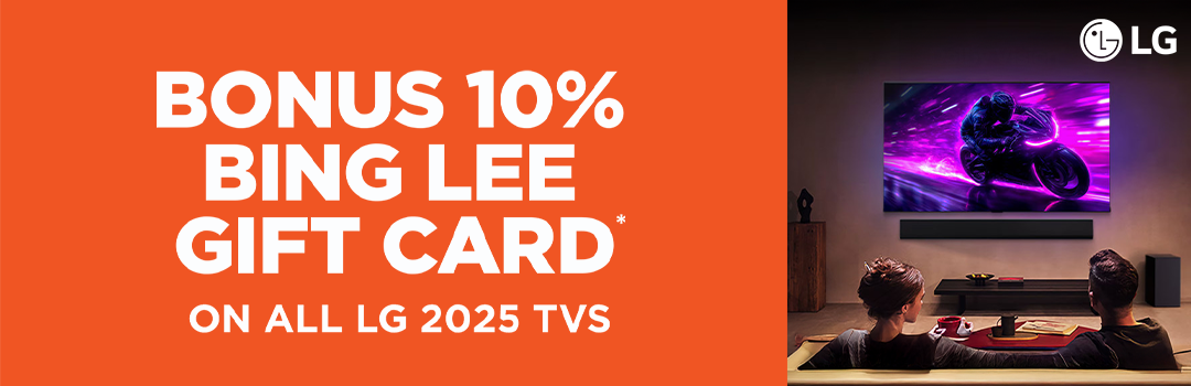 *Purchase a selected LG 2025 TV (“Participating Products”) at a Bing Lee bricks and mortar retail store or online at www.binglee.com and receive a Bing Lee Bonus Gift Card (“Bonus Gift Card”) totalling 10% of the purchase price of each Participating Product. Promotion available on qualifying purchases made from 16/04/26 to 20/04/26 (inclusive), while stocks last and may be withdrawn or extended at any time by Bing Lee ("Promotional Period"). With the exception of Extended Warranties, Bonus Gift Card can only be used on future purchases and can be redeemed at any Bing Lee retail store or online at www.binglee.com.au within 3 months of the qualifying purchase. This Promotional Offer cannot be used in conjunction with any other offer (including but not limited to Bing Lee’s Competitor’s Pricing Policy) or promotion. Bonus Gift Card is not refundable and not redeemable for cash, credit or the purchase of any Gift or Bonus Gift Card. If Customer cancels or returns a purchase of a Participating Product, Customer must either return the unused Bonus Gift Card to Bing Lee or the value of the Bonus Gift Card will be deducted from any refund provided to the Customer as a result of the cancelled transaction. For personal shoppers only and purchase quantities are limited to a maximum of three (3) of the same Participating Products per Customer during the Promotional Period. Conditions apply. Visit https://www.binglee.com.au/articles/help/bonus-gift-cards-terms-and-conditions for additional terms and conditions.