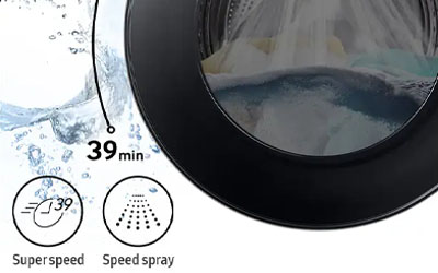 Cut down on laundry time without compromising. Super Speed cycle thoroughly washes up to a 5kg load in just 39 minutes6 with dynamic drum rotation and Speed Spray to help remove detergent quickly and reduce rinse time. It also accelerates spin speed to quickly spin dry clothes resulting in a quick wash.