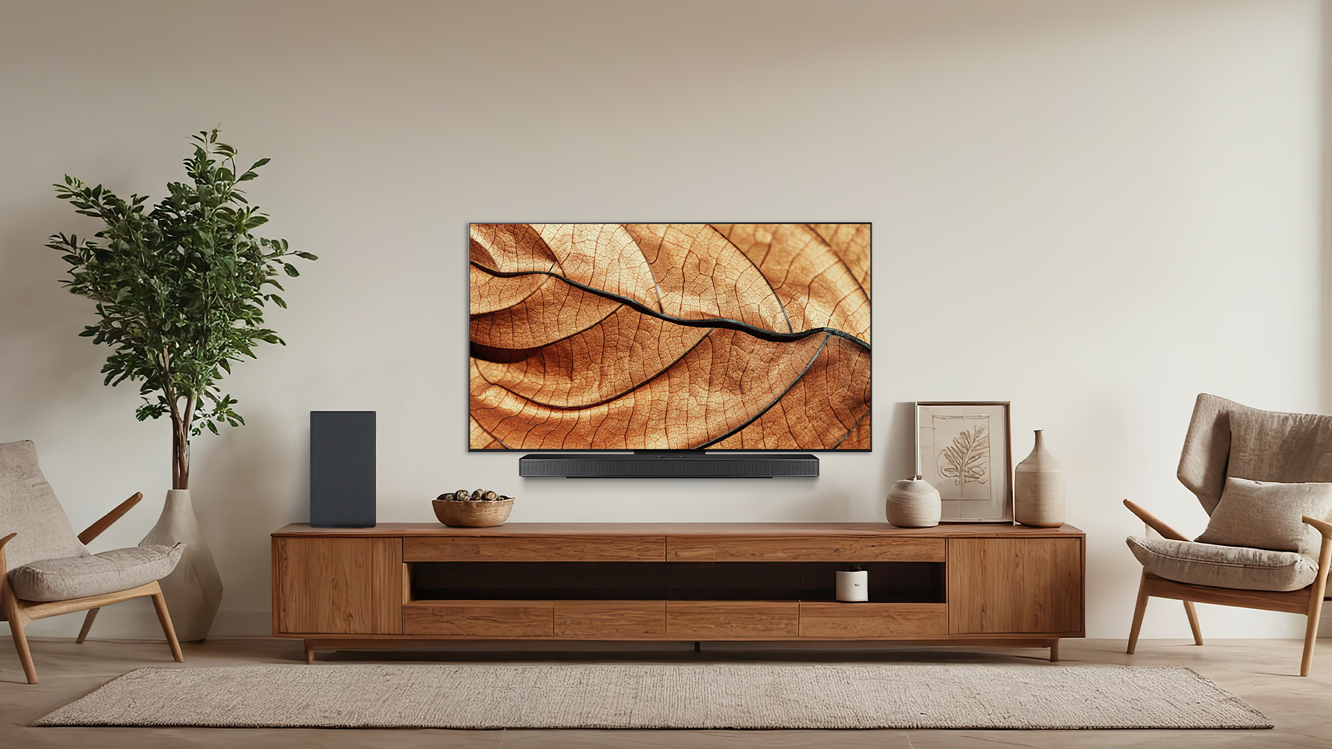 Every scene looks stunning because each of the 8.3 million pixels produces its own light and can switch off completely, giving you blacks that are truly black and colours that genuinely pop. Bright scenes are vivid and crisp, dark scenes hold incredible detail, and it all happens automatically thanks to LG's latest AI processor working behind the scenes. Whether you're watching a blockbuster, a footy match, or a Sunday morning cooking show, the picture adjusts itself to look its best. Sound keeps pace too — with Dolby Atmos support, you get layered, room-filling audio that makes what you're watching feel real.