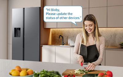 Control your refrigerator easily with your voice. Samsung Bixby1 is built-in to the fridge, so you can control settings, select functions and ask questions using your voice. It even communicates based on prior conversations contexts and can recognise multiple commands in one sentence2.