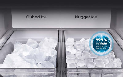 The fridge features a dedicated compartment capable of making two sizes of ice – cubed and nugget – at the same time. Its generous capacity ensures there’s always plenty to go around. Enjoy your preferred ice type at home, perfectly suited to each family member’s taste.