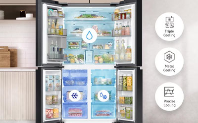 Keep food fresh for a long time and preserve its natural flavor and aroma. Triple Cooling supplies cool air independently to the 3 compartments in the fridge and freezer. It maintains the optimal temperature and humidity in each and ensures that your food is not tainted by other strong smells.