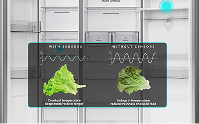 Multiple Digital Temperature Sensors are built into the refrigerator, which accurately and constantly inform our Durable Inverter to optimally adjust the cooling and freezing level of the refrigerator.