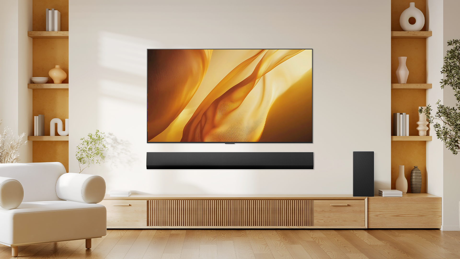 The slim, elegant design sits flush against your wall or looks equally great on its stand, suiting modern living rooms without dominating the space.