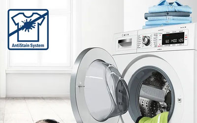 With the AntiStain Removal system, your washing machine or washer-dryer can tackle four stubborn types of stains with ease. It automatically adjusts the temperature, drum movement and soaking time to easily remove butter/oil, grass, red wine and blood stains.