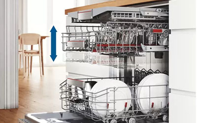 The height of the top basket can easily be adjusted and you can do this even when it's fully loaded. That means even more adjustment options and maximum flexibility. Rackmatic also allows the dishwasher to operate with one side of the top basket angled higher or lower, allowing tall plates in the lower basket and long stem glassware in the top basket to be washed simultaneously.