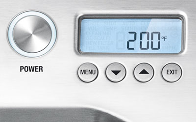 - Backlit LCD display shows current espresso settings and shot clock.