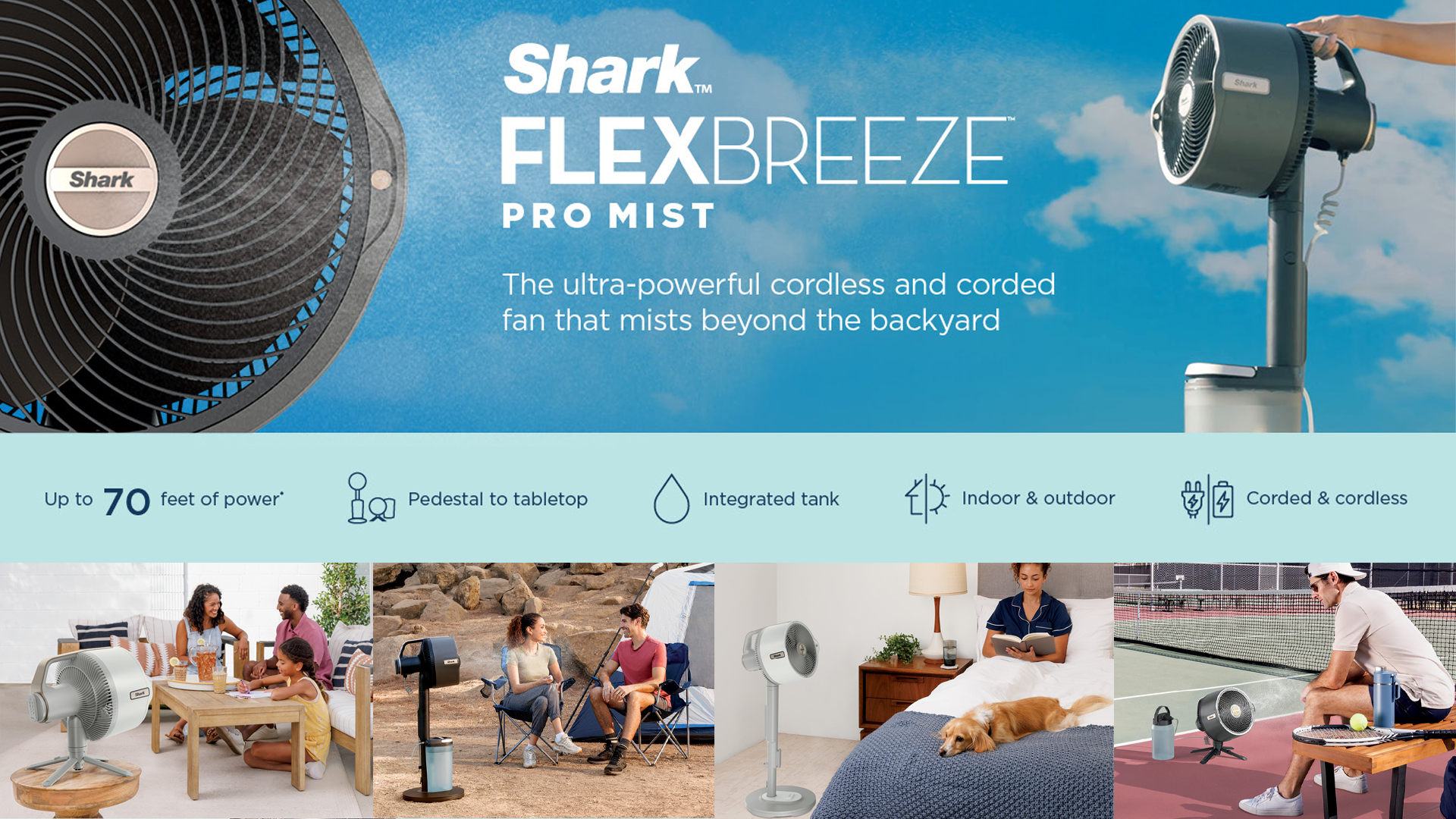 Shark FlexBreeze Pro Mist is an ultra-powerful indoor and outdoor fan with 70 ft. reach. Bring the breeze with portable outdoor misting and whisper-quiet performance. Transforms from pedestal to tabletop, corded or cordless with long-lasting battery.