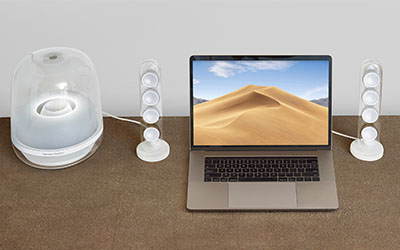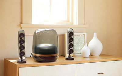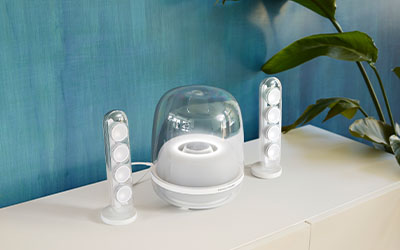 Harman Kardon SoundSticks 4 make a statement in any contemporary home. The groundbreaking transparent dome design and sleek silhouette blend in seamlessly with your decor. The two satellite speakers and subwoofer cover look stunning with an inner rippled surface design reflecting the beauty of music.