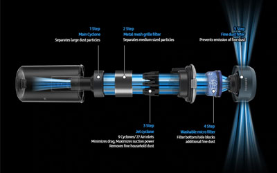 Clean various types of floor effectively with the maximum suction power. The Digital Inverter Motor generates suction power of up to 150W. The aerodynamic design of the air system optimises the airflow, while multi-cyclonic air filtration efficiently traps fine dust particles.