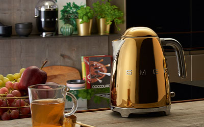 The 2-slice toaster and kettle from the "50s" range are now available in the exclusive metallic shades of Gold and Copper. These rich and luxurious hues evokes an opulence and glamour to the space around them.