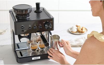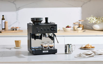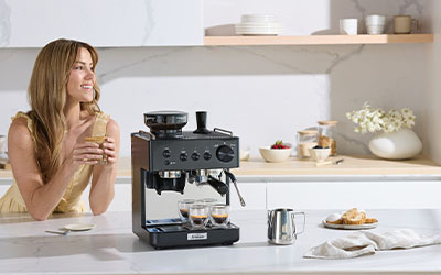 A built-in conical burr grinder with Tap & Go auto dosing produces fresh grounds and in accurate amounts for single or double espresso shots. Extract maximum espresso flavour with the 58mm commercial size group head and preset single or double shot extraction. With silky milk frothed with a powerful steam wand, enjoy delicious cups of coffee everytime. When it's time to clean your machine, simply press one button.