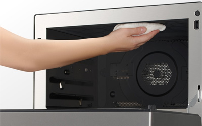 The oven features a stainless steel interior and combines the power of steam with Auto Cleaning programs to make short work of any mess. The clever internal design which eliminates the turntable and integrates the grill heater into the roof cavity reduces the surfaces where food splatter can settle. The exterior is also free of buttons and knobs, making it a breeze to clean the entire oven, inside and out.