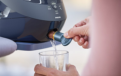 The 1.8-liter transparent water tank gives you up to 2 hours of continuous use. When the water tank is empty, you will be reminded by the indicator light to refill at any time which you can easily do under the tap through the large filling door.
