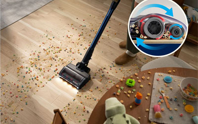 This 3-in-1 stick vac with DualBrush Technology conquers large debris like dog kibble, small debris like pet hair, and everything in between.