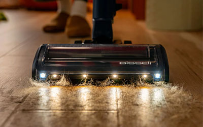 The foot of the PowerClean DualBrush cordless stick vacuum reveals hidden pet fur with FurFinder™ Headlights, which use high- and low-beams to illuminate debris you might otherwise not see.