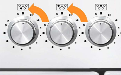 To prevent the unwanted use by children, the hob can be locked. To lock the hob, simultaneously turn the two left-hand controls counter-clockwise and hold until the ‘key lock’ symbol appears in the centre of the hob control display. Locking the hob will NOT affect the oven; it can still be used. To unlock the hob, simultaneously turn the two left-hand controls counter-clockwise and hold until the ‘key lock’ symbol disappears from the centre of the hob control display.