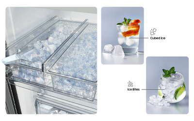 Make sure you are always prepared for any occasion with two different types of ice. The Dual Auto Ice Maker has two separate ice makers that make regular Cubed Ice and Ice Bites™. The Ice Bites™ are smaller and chill drinks fast, so they are especially good for families with children. It can make up to 2.6kg of ice a day and store up to 3.1kg at a time.² And because it is in the freezer instead of the door it frees-up storage space in the fridge.