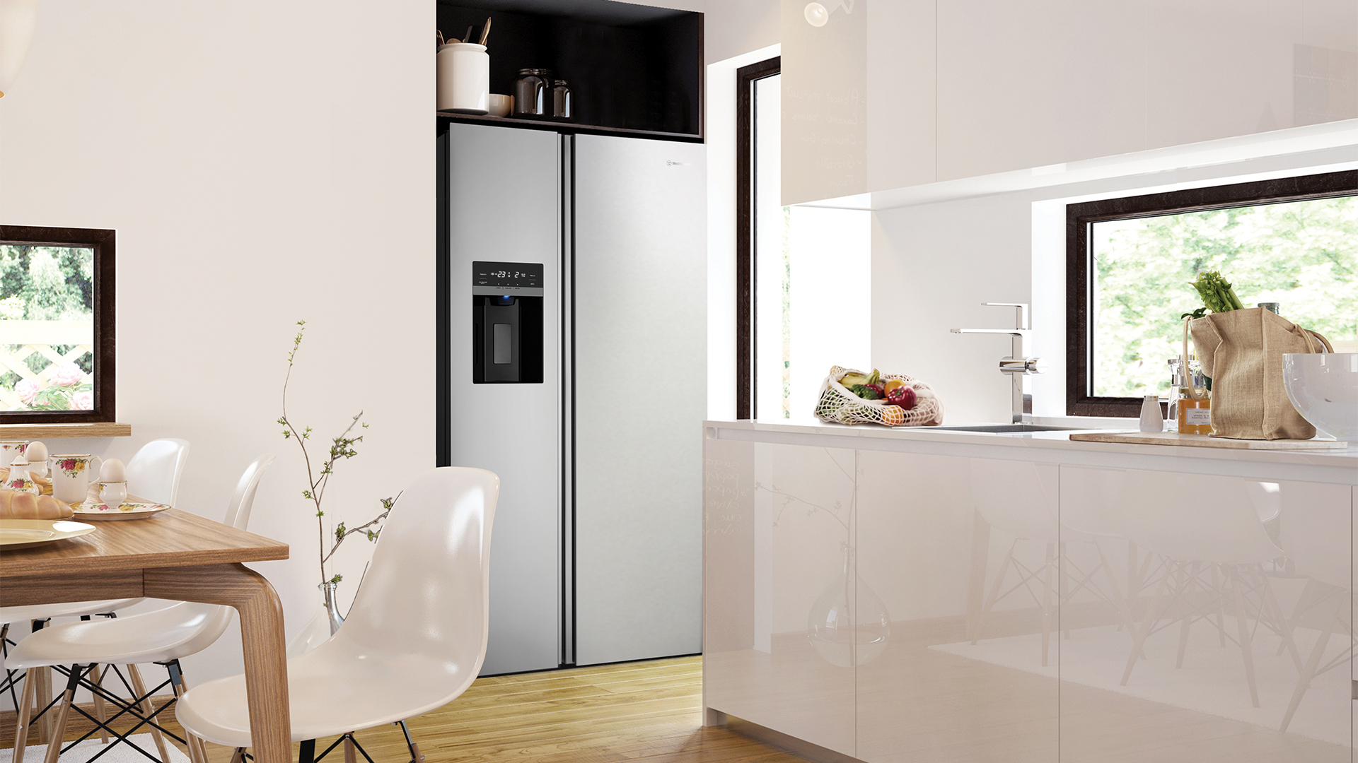 596L side by side fridge, silver, with plumbed ice & water door dispenser, fruit & vegetable boxes and 4.5 stars energy rating.