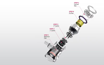 The air filtration system can remove the majority of dust particles from household surfaces down to 2.5 microns in size. Larger particles are separated in steps 1-3 and deposited in the dust bin, while finer dust is filtered and captured in steps 4-5.