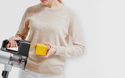 The interchangeable and rechargeable batteries are easy to swap. Simply push the buttons on both sides and slip the battery in or out. Single Battery Power Pack included. The CordZero handstick can be stored easily and neatly in your house in two different ways: Wall-mount mode and Compact mode.