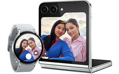 Pair your watch with Galaxy Z Flip5 to capture the healthy you up close or from a distance. Galaxy Z Flip5's Flex mode and Camera Controller let you easily switch between photo and video mode, or zoom in and out, all from the comfort of your wrist. Then tap the shutter button on your watch to take a pic.1415